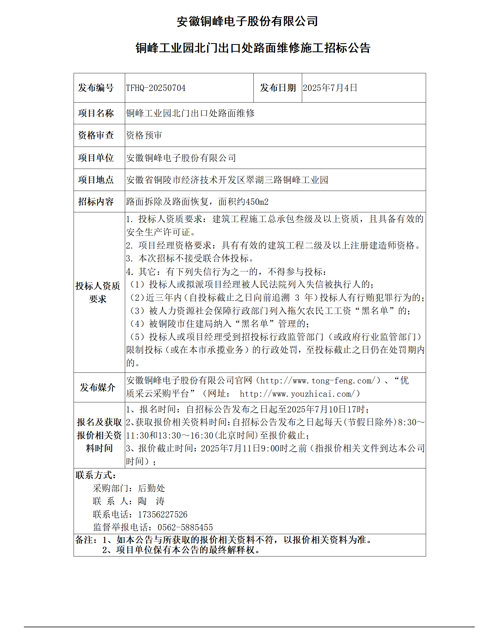 Bevictor伟德 (铜峰工业园北门出口处路面维修招标公告)_01