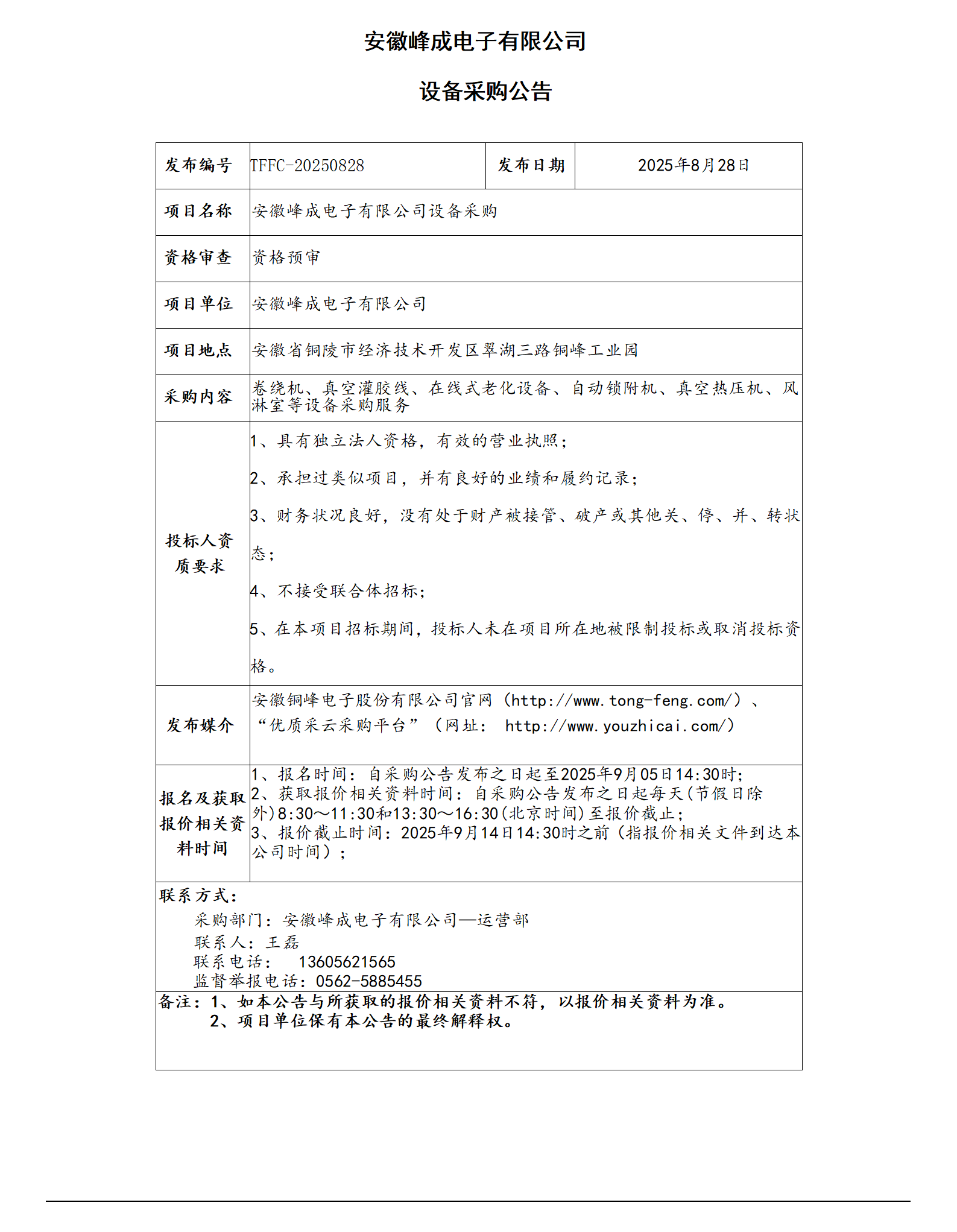 安徽峰成电子有限公司设备采购公告_01